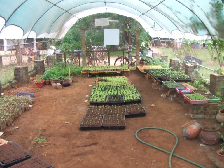 In these initial years the farm slowly took shape. First by installing a water tank and irrigation system, building a nursery (which moved three times before settling in its present place) together with building accommodation for Priya and her daughters. We wanted to use renewable energy and so also set up our first small solar systems. It was during these initial years that people first came to help on the farm with gradually more people coming to visit to see and learn from what we were doing.