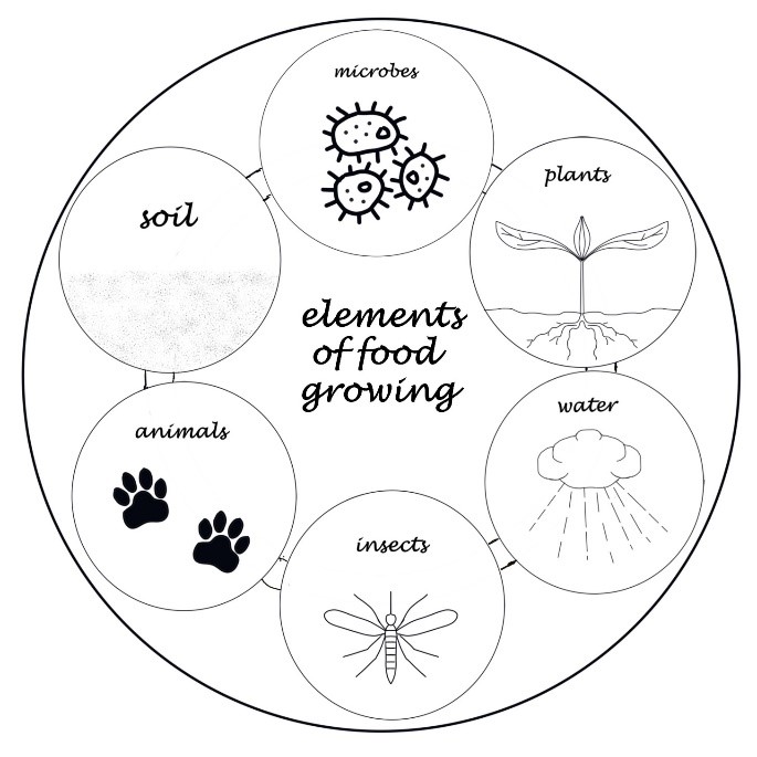 To grow food we need soil, microbes, water, plants, insects and animals. We call these the “elements of food growing”, each of which comes from the Earth and is sustained and renewed by Earth’s natural cycles. We work with these elements in ways that support the natural cycles. This enables each element to be continuously renewed and thus we can carry on growing food in Buddha Garden indefinitely.